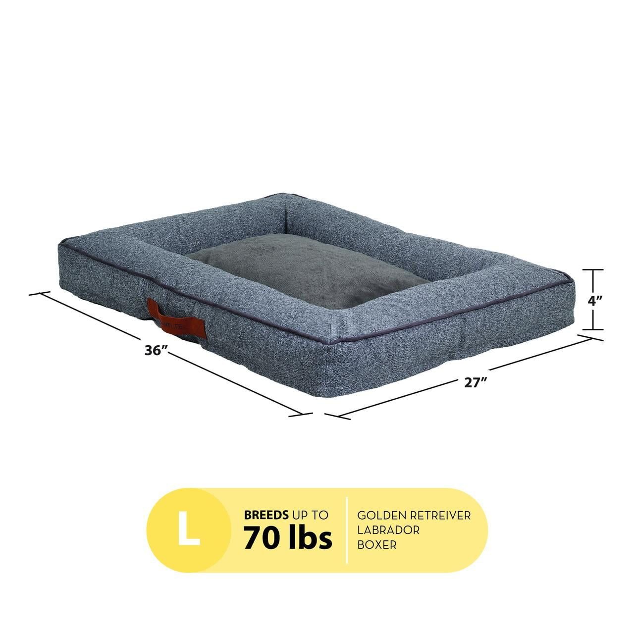 Designed for the fashionable and trendy dog, this Brown Rectangle Bolster Bed from offers comfort and softness for larger dogs that love to curl up. The bed features a shredded foam sleep center with a cushy fabric center, complemented by a sophisticated solid fabric with trim. Faux leather handles add a touch of luxury, making this bed fit for a king or queen. The soft poly-fiber filled bolsters around the edges provide a perfect headrest for better sleep. Whether it's a larger dog or a smaller dog that prefers more space, the Rectangle Bolster Bed will become their new favorite spot to hang out. The machine washable cover ensures easy care and maintenance.